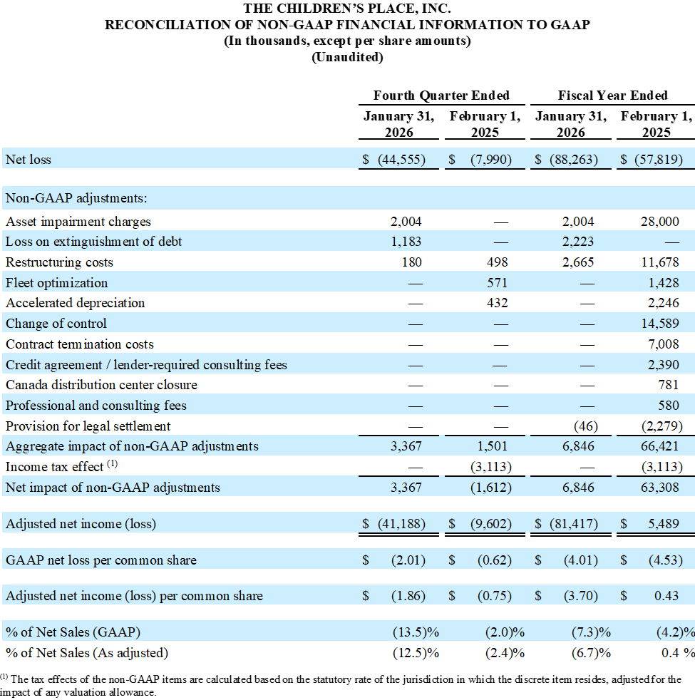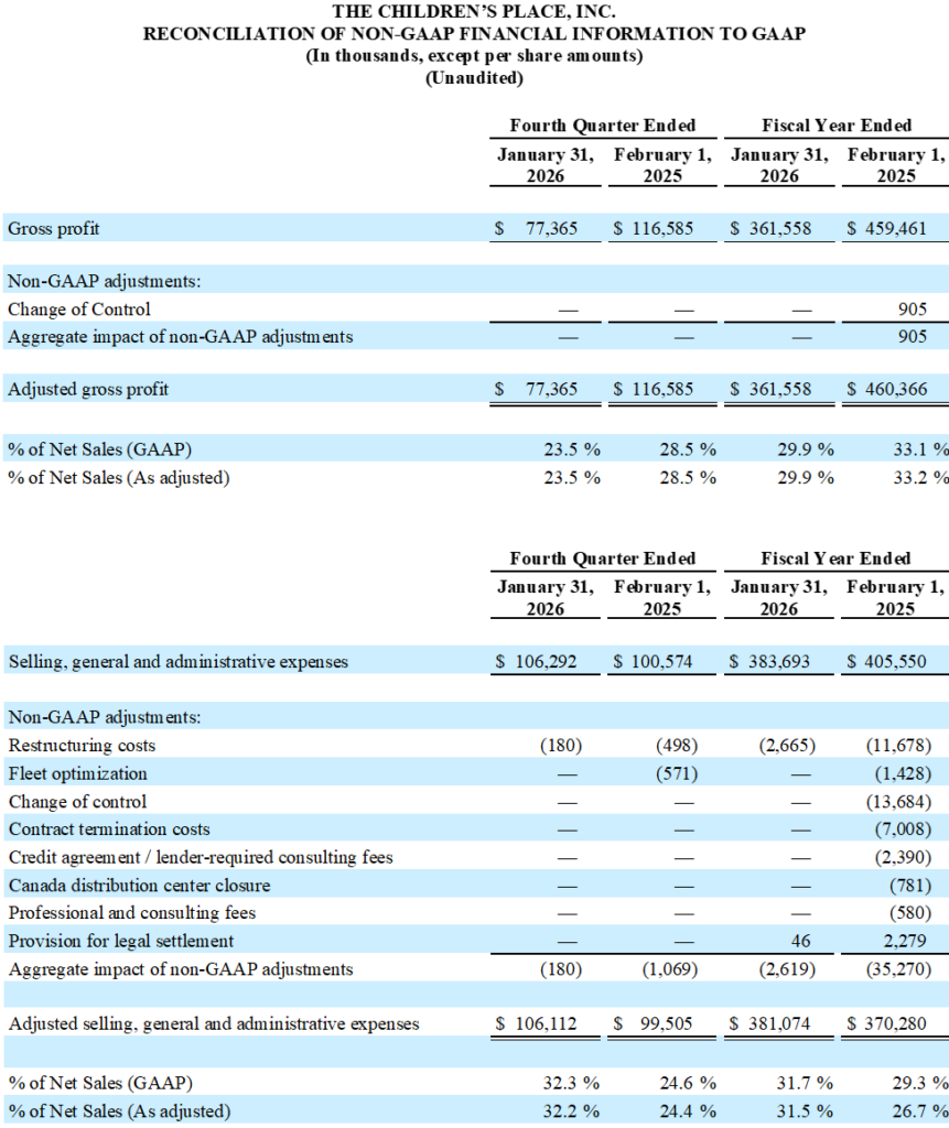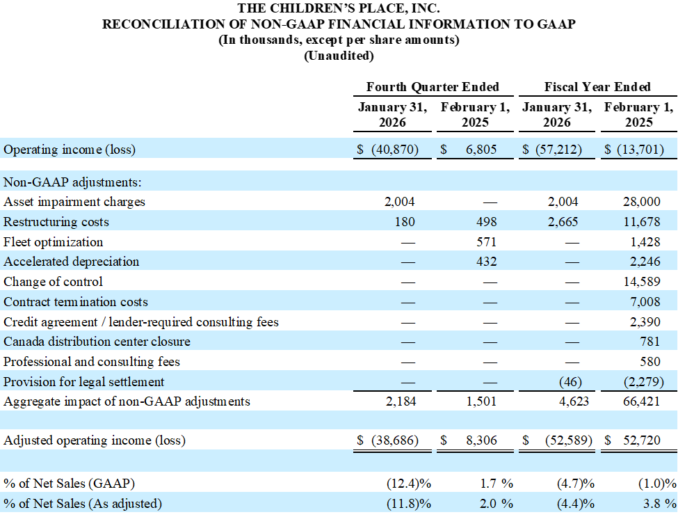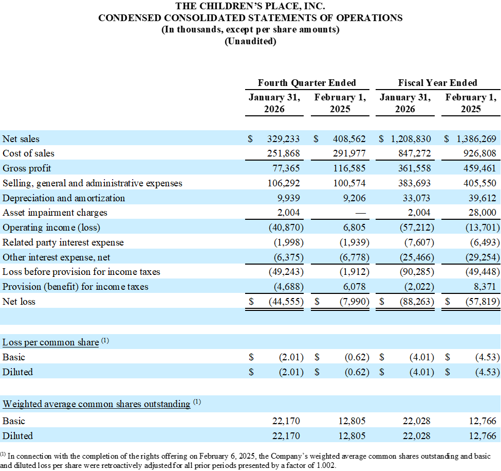 SECAUCUS, N.J., April 10, 2026 (GLOBE NEWSWIRE) — The Children’s Place, Inc. (Nasdaq: PLCE), one of the only pure-play children’s specialty retailers in North America with an omni-channel presence, today announced financial results for the Company’s fourth fiscal quarter and the full fiscal year ended January 31, 2026.