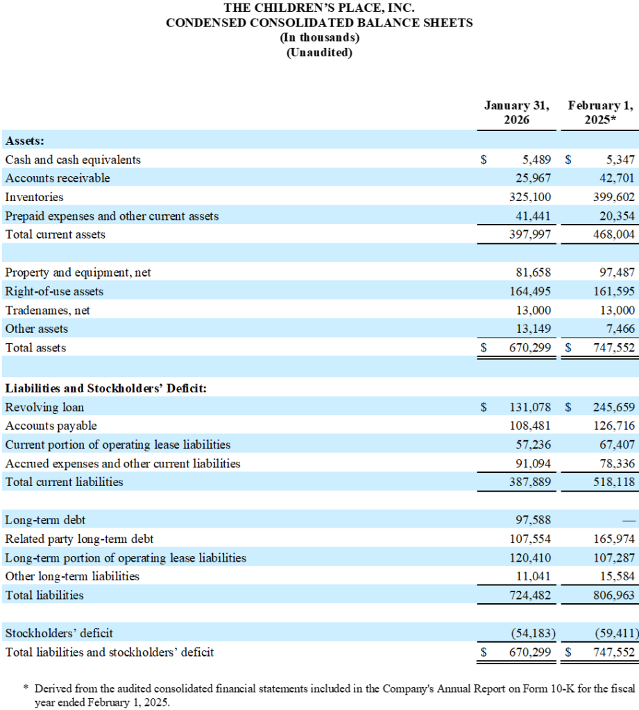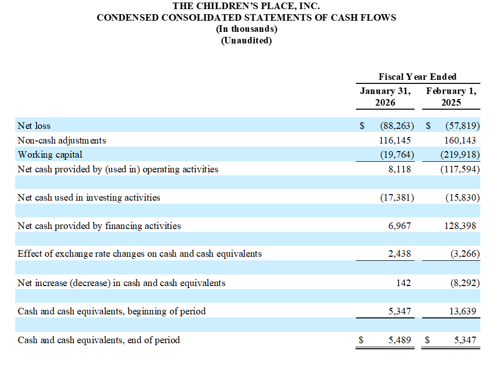 As of January 31, 2026, the Company had $5.5 million in cash and cash equivalents, $44.4 million in borrowing availability under its revolving credit facility and an additional $40.0 million of availability under the unsecured Commitment Letter provided by Mithaq, representing total liquidity of $89.9 million. The Company had $131.1 million outstanding on its revolving credit facility and has not drawn down on its Mithaq credit facility. Additionally, the Company generated $8.1 million in operating cash flows in the twelve months ended January 31, 2026, compared to $(117.6) million in the twelve months ended February 1, 2025, reflecting a significant improvement of $125.7 million, as the Company improved its working capital management with a reduction in inventory balances of $74.5 million compared to the prior year.